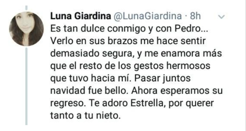 Hacia fines del 2019, habiendo ya nacido Pedro y haber sido reconocido por Laurta como su hijo, el acoso por parte de Giardina llegó al extremo de analizar las fotografías que subían Laurta y su pareja a las redes para identificar el hotel en el que se alojaban y enviarles mensajes amenazando con presentarse en el Hall del hotel para increparlos.