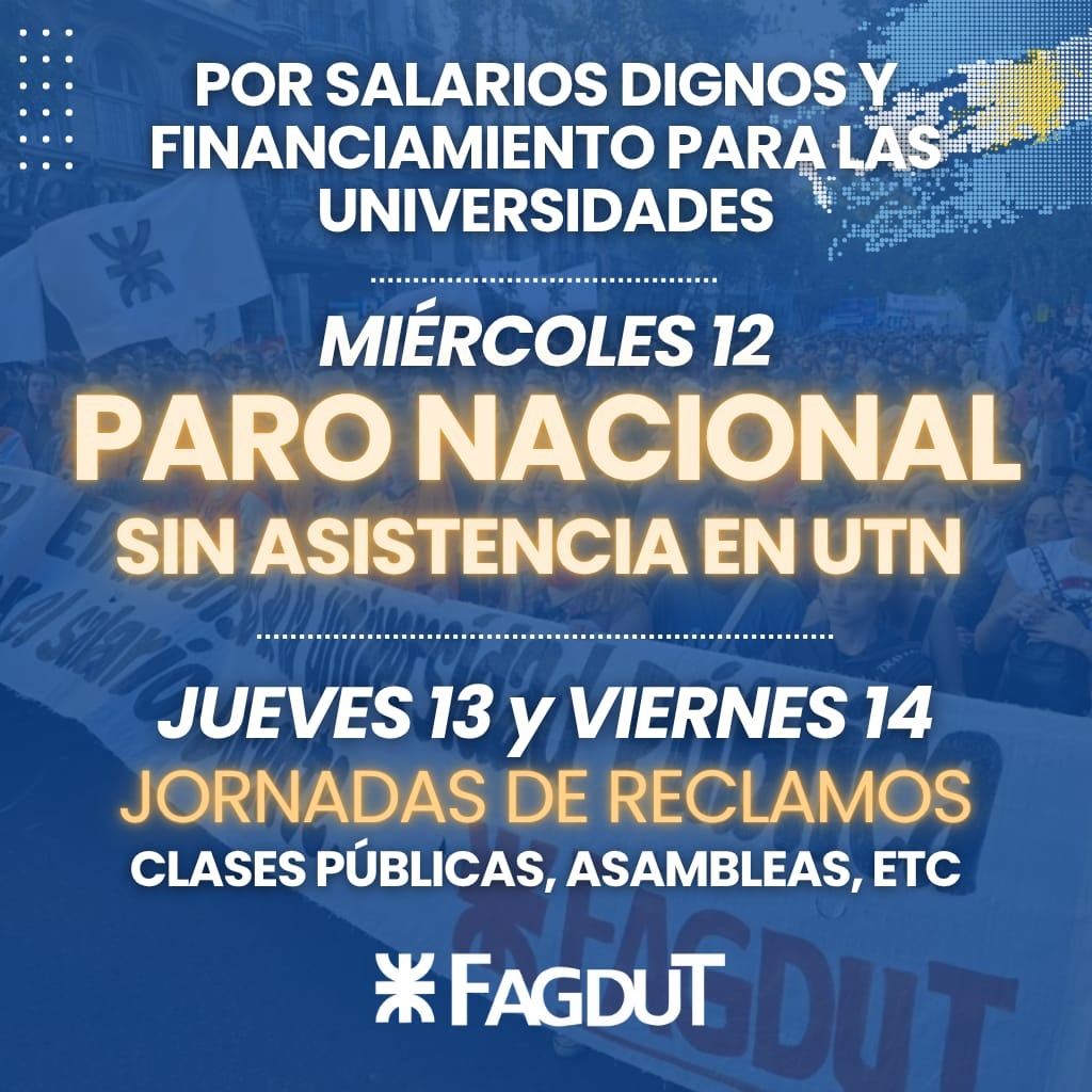 Por su parte, la Federación Argentina de Docentes de las Universidades Tecnológicas (FAGDUT) —que representa a los docentes de la Universidad Tecnológica Nacional (UTN)— lanzó también una protesta de 72 horas, pero con diferente modalidad: