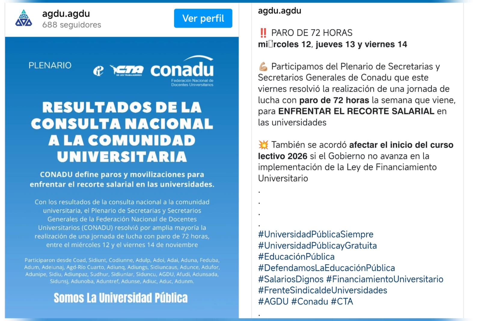 “Participamos del Plenario de Conadu que resolvió el paro de 72 horas para enfrentar el recorte salarial en las universidades. También se acordó afectar el inicio del curso lectivo 2026 si el Gobierno no avanza en la implementación de la Ley de Financiamiento Universitario”, expresó la entidad.
