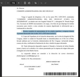 Sin embargo, esa afirmación queda seriamente comprometida por un oficio judicial fechado el 14 de mayo de 2025, remitido por el Juzgado Federal N°1 de Concepción del Uruguay a la propia CARU. El documento, firmado por el juez federal subrogante Hernán Sergio Viri y el secretario Lucas Edgardo Claret, solicita formalmente al organismo binacional una serie de informes directamente vinculados a la denuncia.