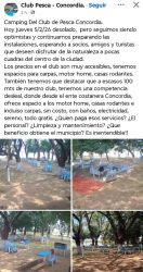 Por medio de su página de Facebook, el Club de Pesca Concordia expresó su malestar por lo que considera una competencia desleal por parte del Municipio, a partir de la habilitación gratuita de espacios para estacionar motorhomes, casa rodantes y carpas a escasos metros de sus instalaciones, bajo la órbita del Ente Costanera. Según el planteo de la institución, la situación afecta de manera directa el funcionamiento del camping del club, que históricamente ofrece servicios pagos pero accesibles, y que se sostiene con recursos propios y el esfuerzo cotidiano de sus socios.