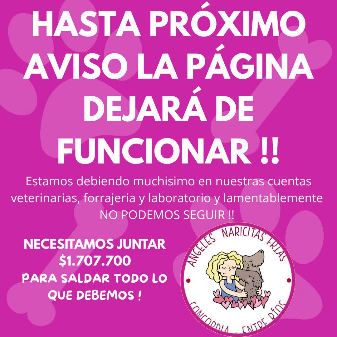 El grupo de rescatistas de Concordia, "Ángeles Naricitas Frías", anunció que su página dejará de funcionar hasta nuevo aviso debido a una situación económica crítica. Con más de 30 animales a cargo, la mayoría de ellos con enfermedades crónicas o de avanzada edad, la organización acumuló una deuda total de $1.707.700 en veterinarias, laboratorios y forrajería, una cifra que se volvió insostenible ante la falta de ingresos fijos y el cese de las adopciones.