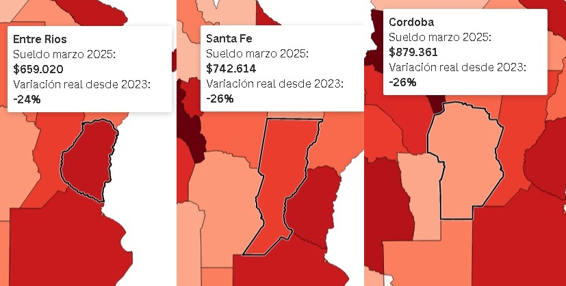 En las provincias vecinas de Santa Fe y Córdoba, un docente que ingresa percibe de movida entre $ 750.000 y $ 800.000. “Eso nos deja muy por debajo a nosotros”, remarcó. Si se considera todo el país, la provincia está levemente por encima de la mitad de tabla.
