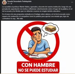 Un docente de la Escuela N° 37 “Ernesto Che Guevara” denunció haber recibido amenazas luego de expresar, durante una jornada pedagógica, que “con hambre no se puede aprender”. El hecho ocurrió en la zona oeste de Concordia y fue dado a conocer públicamente por la propia institución a través de un comunicado en el que manifestaron su respaldo al profesor Martín Valdéz, egresado y actual integrante del plantel docente.