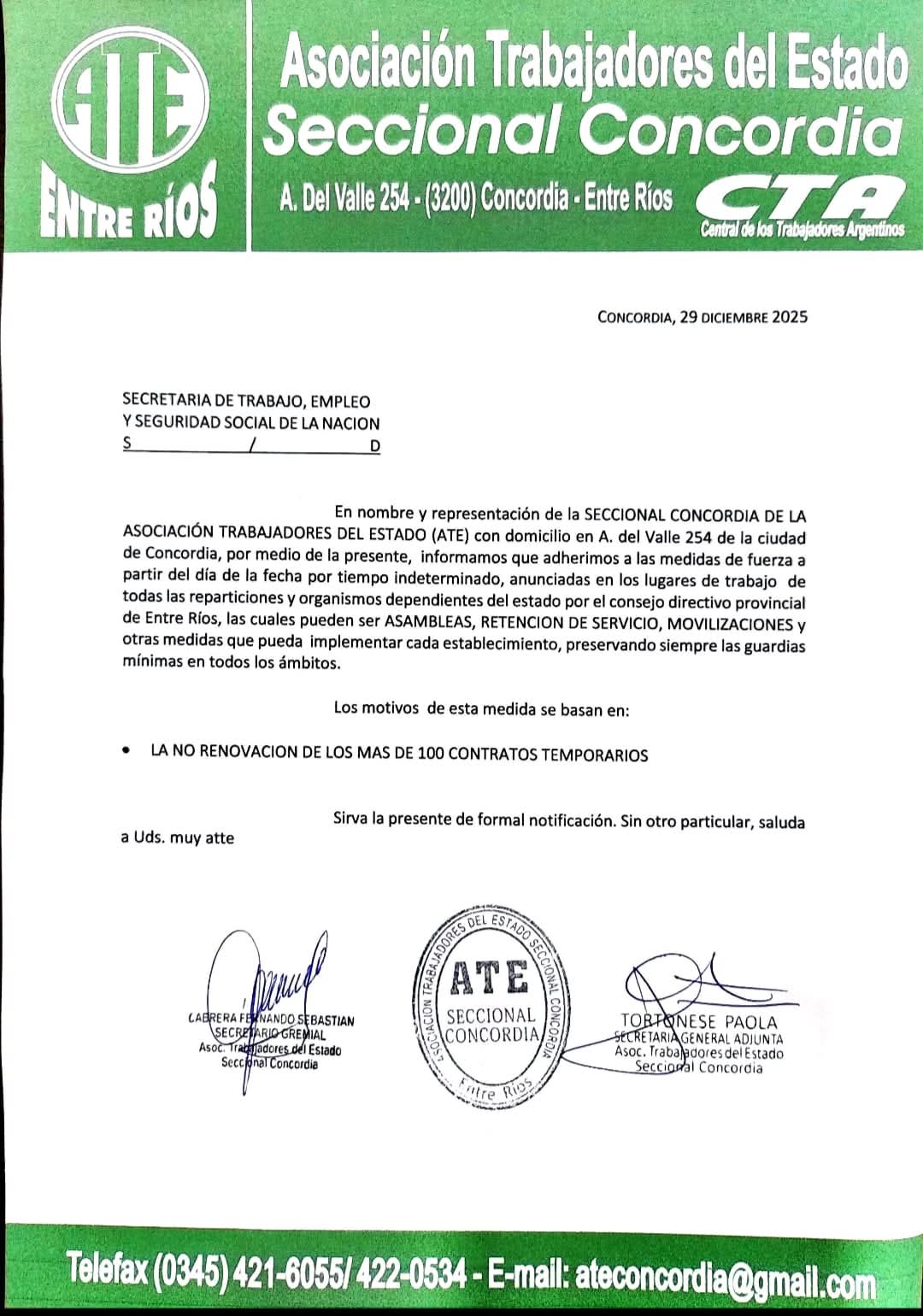 Según la notificación elevada a la Secretaría de Trabajo, Empleo y Seguridad Social de la Nación, ATE Concordia adhiere a las medidas resueltas por el Consejo Directivo Provincial, que pueden incluir asambleas, retención de servicios, movilizaciones y otras acciones gremiales, garantizando las guardias mínimas en todos los ámbitos.