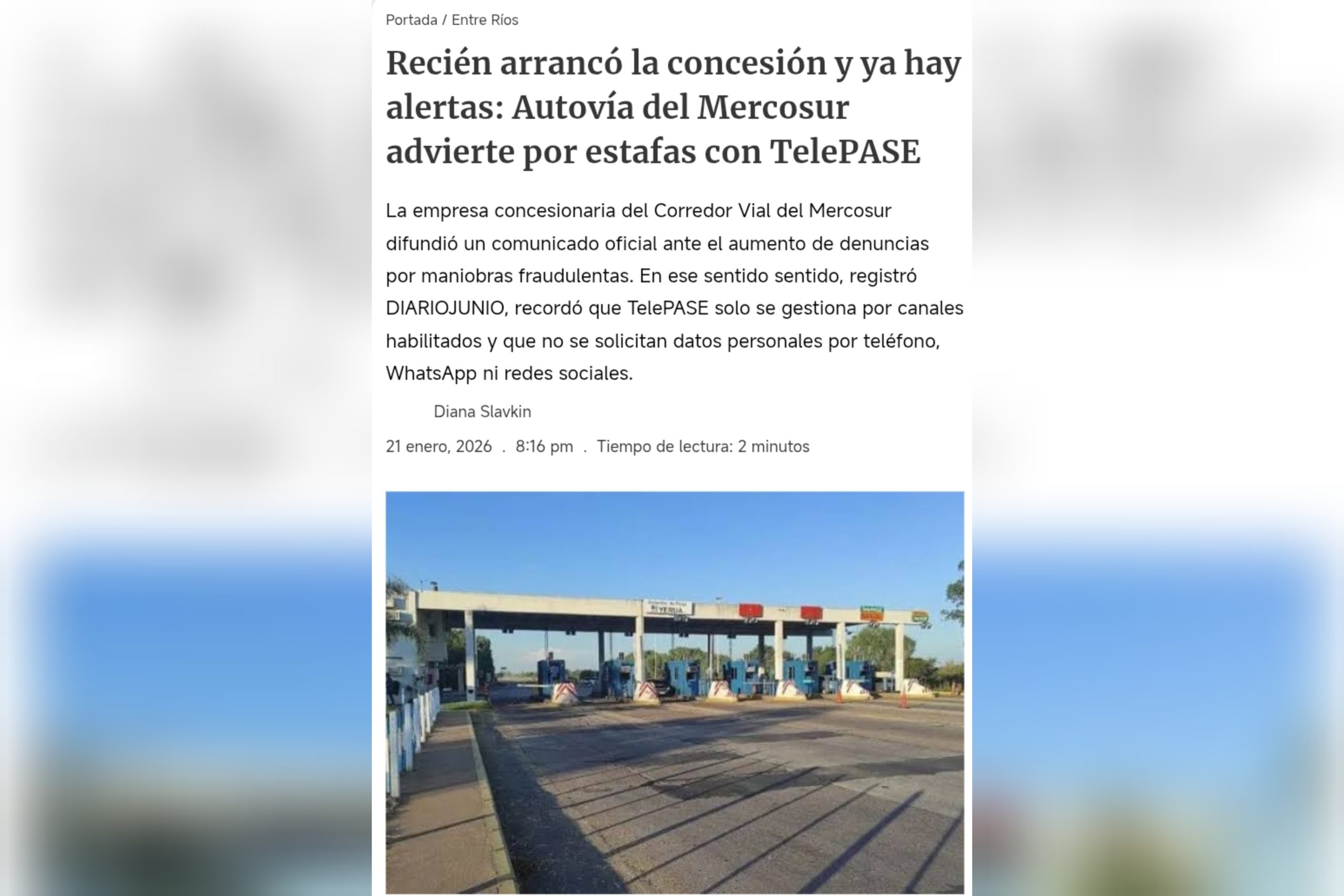 Vale recordar que, apenas implementado el sistema en la región, la concesionaria Autovía del Mercosur —que administra las rutas nacionales 12, 14 y 18— alertó sobre intentos de estafa y comunicaciones maliciosas destinadas a obtener datos personales o bancarios de los usuarios.
