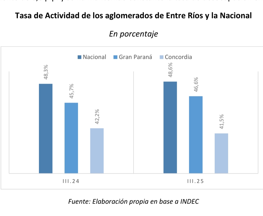 El trabajo señala que los indicadores del mercado laboral, construidos a partir de la Encuesta Permanente de Hogares (EPH), muestran comportamientos dispares entre los principales aglomerados urbanos de Entre Ríos. En Concordia se registró una caída en las tasas de actividad y empleo, junto con un aumento de la desocupación. En contraste, el Gran Paraná evidenció mejoras tanto en la actividad como en el empleo, mientras que la tasa de desocupación se mantuvo estable, en torno al 5%.