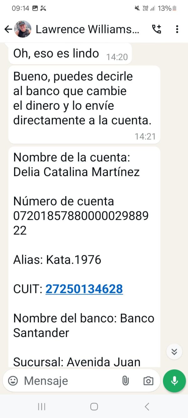 Con el correr de los meses, la relación derivó en un vínculo afectivo sostenido mediante mensajes diarios, promesas de viaje a la Argentina y reiterados pedidos de dinero bajo distintos pretextos: gastos de traslado, permisos internacionales, supuestas gestiones ante organismos humanitarios y costos administrativos para poder salir de la zona de conflicto y viajar a la Argentina.
