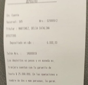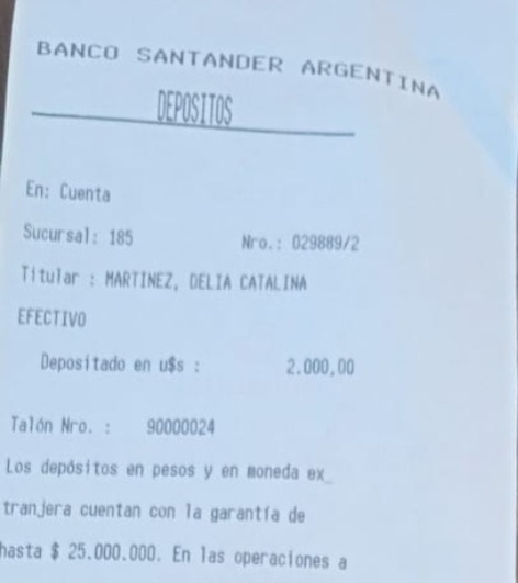 “Cuando le pedí los tickets, mi mamá me entregó comprobantes de depósitos hechos por caja en el Banco Santander de San Miguel, todos a nombre de Delia Catalina Martínez”, explicó Adriana. “Ahí fue cuando me pregunté cómo podía ser que, hablando con un hombre, el dinero terminara siempre a nombre de una mujer”.