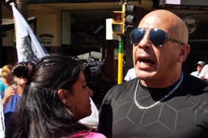 El agresor, de lentes, remera y shorts negros, increpando a los docentes que marchaban esta mañana