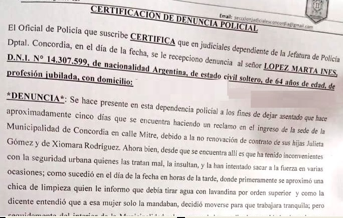 Más tarde, en la Jefatura de Policía, Marta López hizo una denuncia. Según una copia de la misma enviada a DIARIOJUNIO, se señala que hacía cinco días que se encontraba haciendo un reclamo en el ingreso de la sede de la Municipalidad debido a la no renovación de contrato de sus hijas Julieta Gómez y de Xiomara Rodríguez.