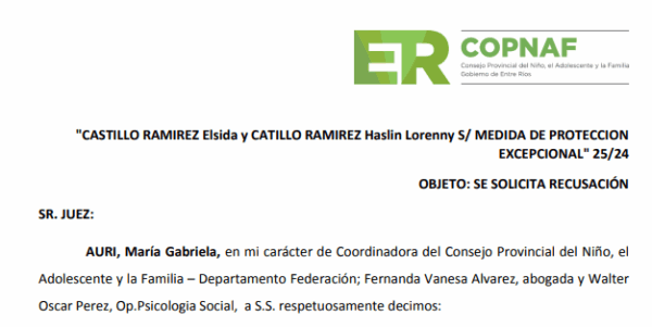 De hecho, María Gabriela AURI, denunció: “en mi carácter de Coordinadora del Consejo Provincial del Niño, el Adolescente y la Familia – Departamento Federación; Fernanda Vanesa Alvarez, abogada y Walter Oscar Perez, Op.Psicologia Social, a S.S. respetuosamente decimos: