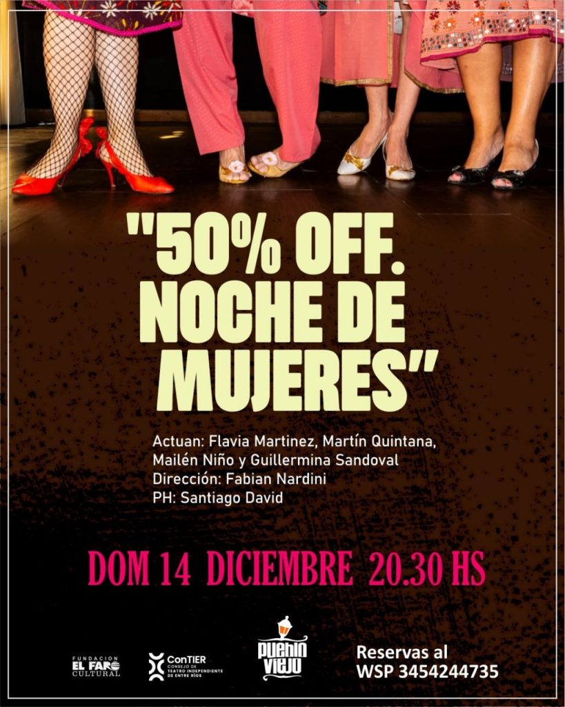 Hoy domingo 21 de diciembre, a las 21 horas, se presentará el espectáculo teatral “50% off. Noche de mujeres”, una propuesta escénica que combina humor, emoción y melodrama en una historia profundamente humana y actual.