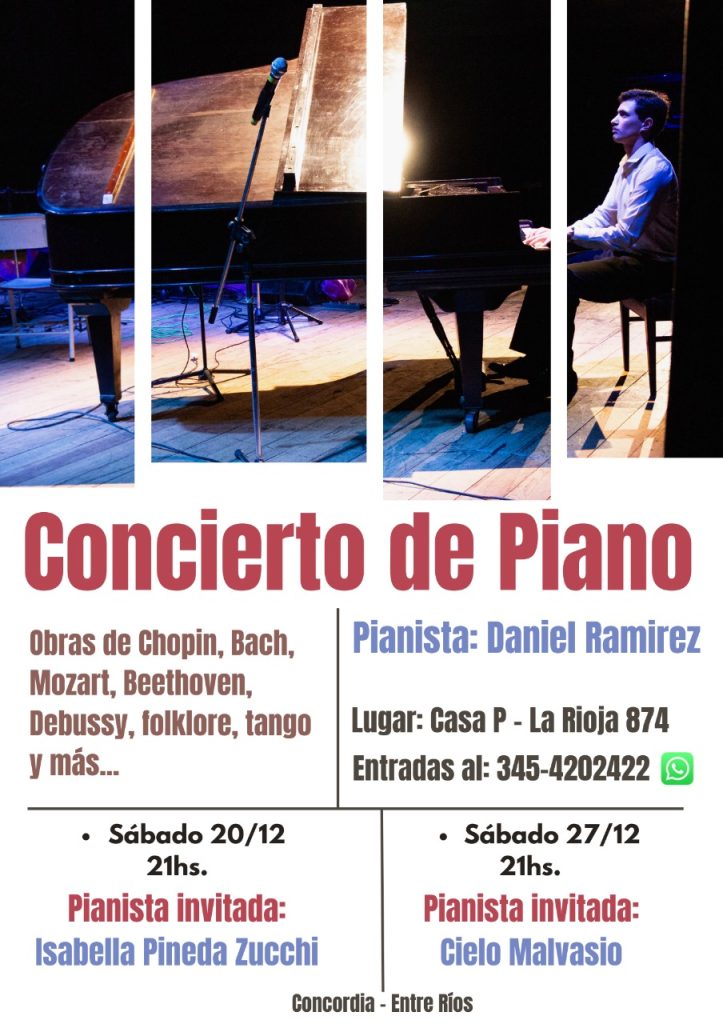 El reconocido pianista Daniel Ramírez, brindará un Concierto de Piano, con un repertorio que viajará a través de obras notorias de grandes compositores como: Chopin, Mozart, Beethoven, Bach y además obras destacadas del folklore y del tango. También, estará presente la pianista invitada Isabella Pineda Zucchi.