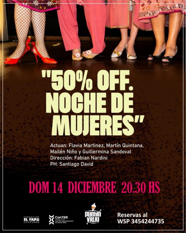 Este es un espectáculo en el que cuatro amigas se encuentran en el bar de siempre, un miércoles, aprovechando la noche de descuentos, a escuchar a Catita, que tiene una urgencia emocional y necesita un par de oídos. A partir de esta historia, se desencadenan las siguientes, porque todas ellas, tienen algo brutalmente honesto para compartir. Una amistad diversa e incondicional que se enriquece en cada encuentro. Esta obra tiene textos de distintos autores y autoras, entre ellas la concordiense Guillermina Sandoval, con la dirección de Fabian Nardini, quien fusionó estos materiales en una comedia melodramática, con una estética humorística, emotiva y muy colorida.