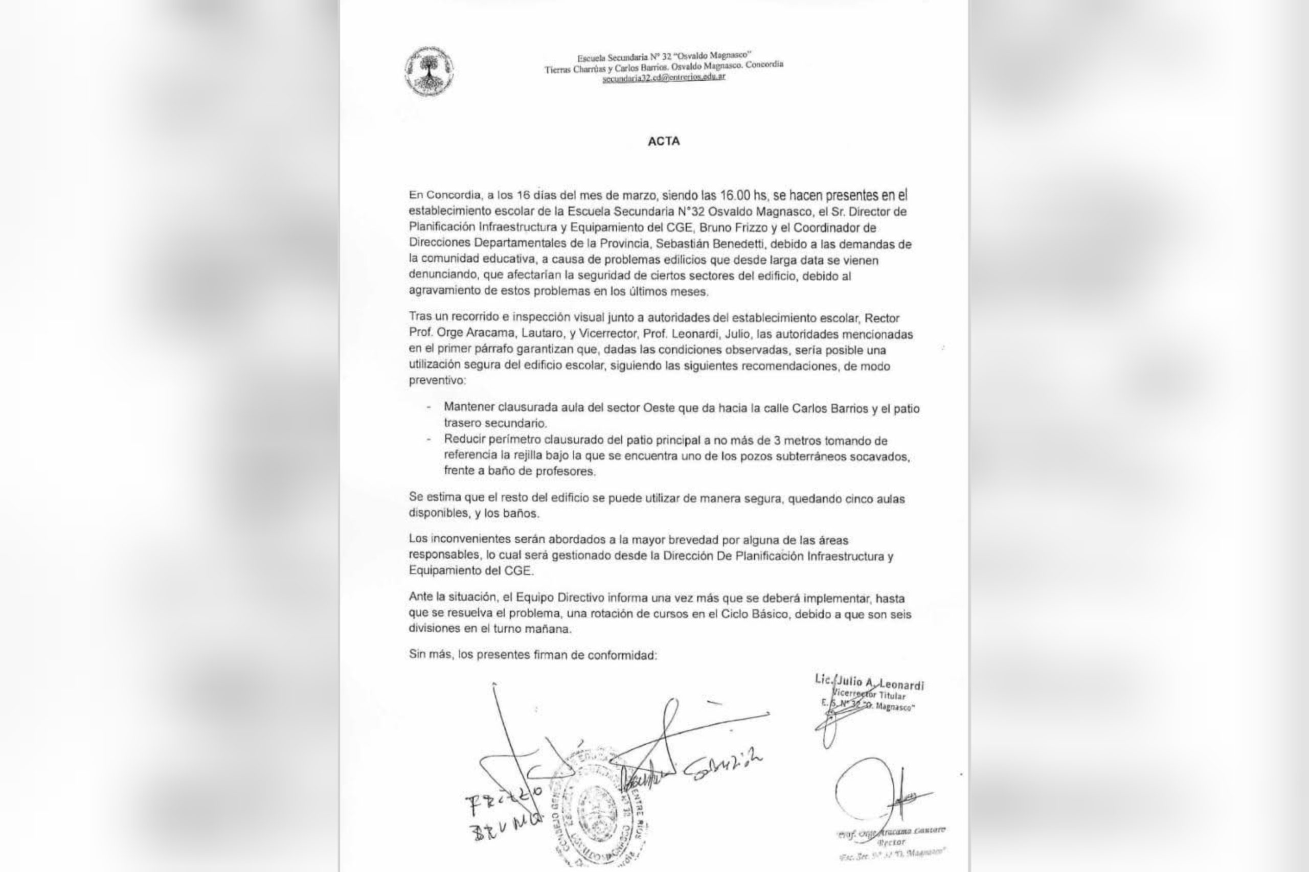 Según ese documento, tras una inspección visual se consideró que el edificio puede utilizarse parcialmente, con la clausura de un aula del sector oeste y la reducción del perímetro restringido del patio principal a tres metros alrededor de una rejilla vinculada a un pozo socavado. También se indicó que cinco aulas y los sanitarios pueden utilizarse, y que los problemas serán abordados “a la mayor brevedad”.