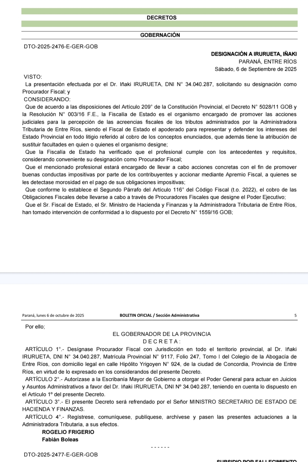 El Gobierno de Entre Ríos formalizó la designación del Dr. Iñaki Irurueta como Procurador Fiscal de la Provincia, cargo clave dentro de la estructura de la Fiscalía de Estado. La decisión fue publicada este lunes en el Boletín Oficial, bajo el Decreto N° 2476/2025 GOB, rubricado por el gobernador Rogelio Frigerio y el ministro de Hacienda y Finanzas, Fabián Boleas.