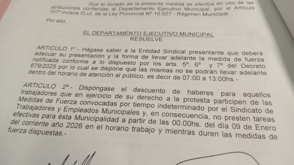 Y el artículo 2° dispone «el descuento de haberes para aquellos trabajadores que en ejercicio de su derecho a la protesta participen de las medidas de fuerza convocadas por tiempo indeterminado por el Sindicato de Trabajadores y Empleados Municipales y, en consecuencia, no presenten tareas efectivas para esta municipalidad a partir de las 00.00 horas del día 9 de enero del corriente año 2026 en el horario de trabajo y mientras duren las medidas de fuerza dispuestas».