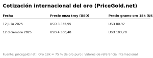 Fuentes: PriceGold.net (Cotización internacional del oro al 12 de julio de 2025) / PriceGold.net (Cotización internacional del oro, diciembre de 2025) /Notas periodísticas e información oficial sobre del remate público de la Caja Municipal de Préstamos de Concordia