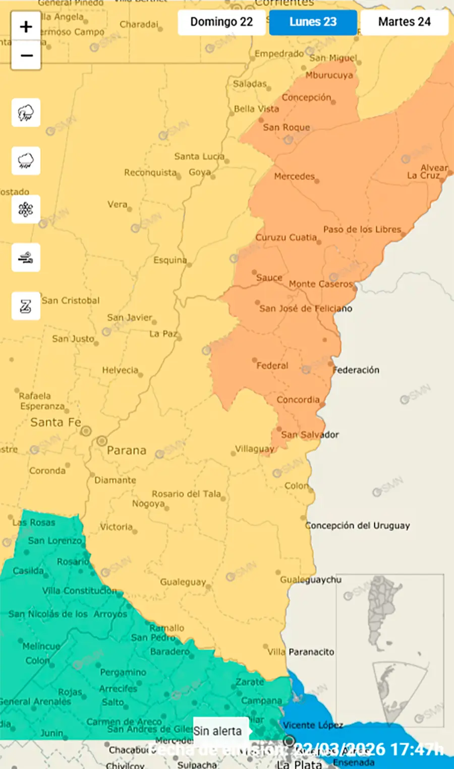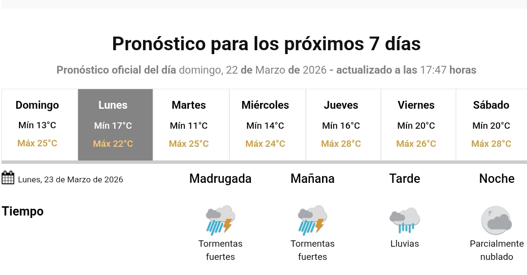Según el organismo, las condiciones comenzarán a mejorar a partir del martes 24 de marzo, con un escenario más estable, sin alertas vigentes y con condiciones climáticas más favorables en toda la provincia
