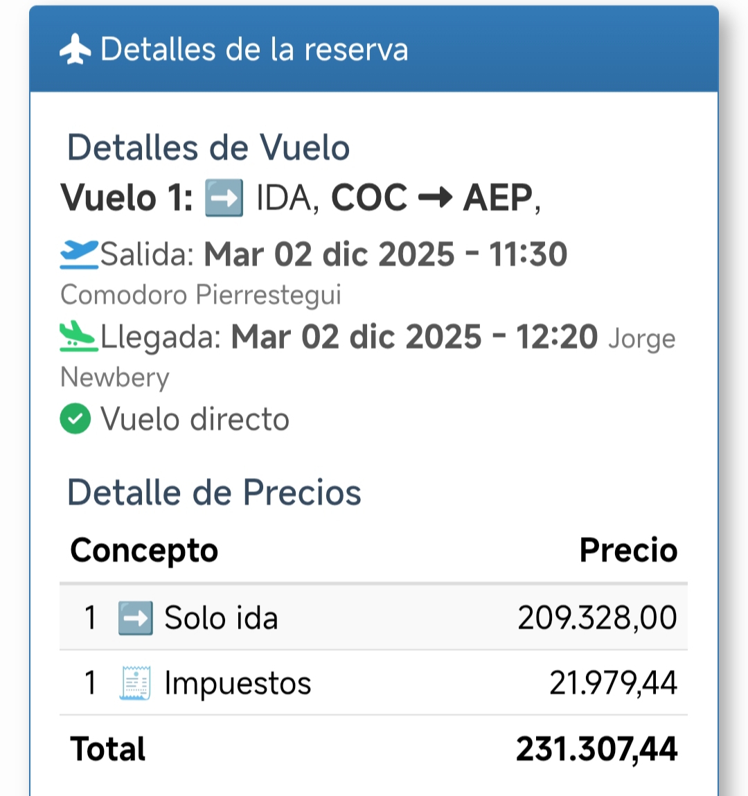 Según la información brindada en una simulación de detalle de reserva, se trata de un vuelo directo y solo de ida, con salida programada a las 11:30 desde Concordia y arribo a las 12:20 al aeropuerto porteño.