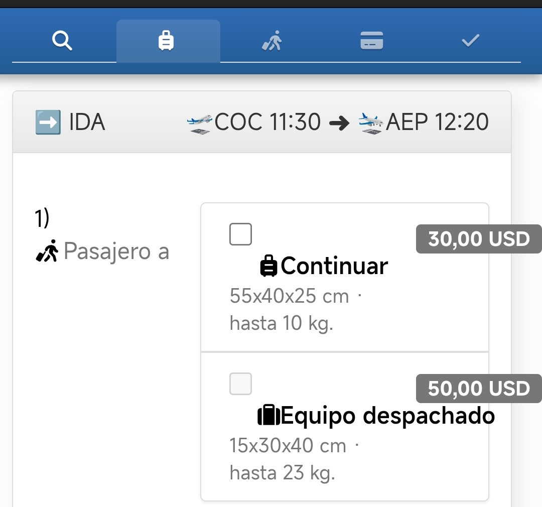 El equipaje de mano de hasta 10 kilos tiene un valor adicional de U$S 30 (equivalente a $44.856), mientras que el equipaje despachado de hasta 50 kilos se abona aparte con un costo de U$S 50 ($74.760). En la simulación de compra, el ítem “equipaje” figura con $0,00, por lo que el monto total calculado corresponde únicamente al vuelo y sus tasas impositivas.