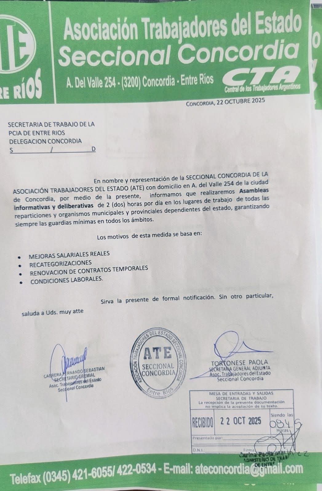 Ante el malestar generalizado de los trabajadores representados por los delegados de la seccional, se resolvió comenzar con las asambleas en todos los sectores estatales de Concordia, garantizando siempre las guardias mínimas en cada dependencia.