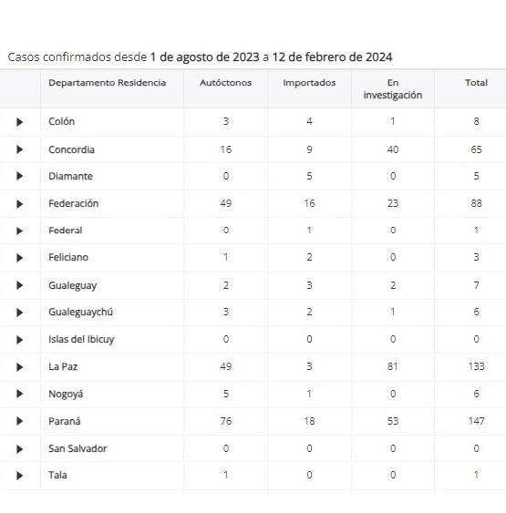 En la última semana se registraron 231 nuevos casos de dengue y 91 de Covid-19 en la provincia. AllÃ, en el monitor de casos de dengue, se informa que en el perÃodo comprendido entre el 1 de agosto de 2023 y el 10 de febrero de 2024, la provincia registra un total acumulado de 539 casos, de los cuales 231 corresponden a la categorÃa de autóctonos; 85 a importados y 223 que se encuentran en investigación (se trata de casos confirmados, pero que resta determinar si corresponden a autóctonos o importados). De este modo, los casos de dengue continúan en aumento mientras que se mantienen estables los casos de coronavirus en relación a los informados en el mismo periodo previo, según información enviada a DIARIOJUNIO. En Concordia se detectaron 65 casos de dengue.