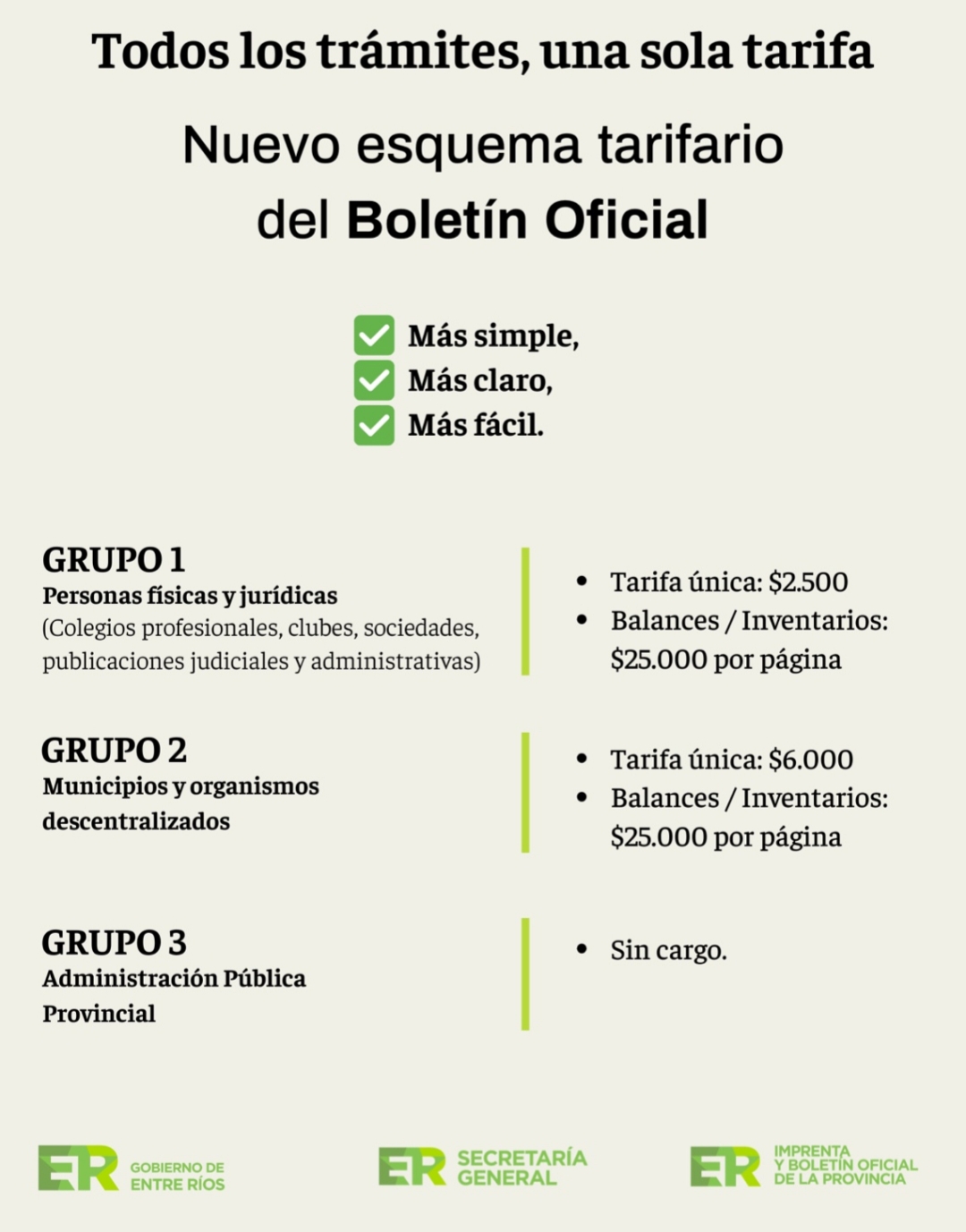 La Dirección de Imprenta y Boletín Oficial de la Provincia de Entre Ríos recordó que desde el 8 de enero de 2026 se encuentra vigente un nuevo esquema tarifario para la publicación de actos y avisos oficiales, en el marco de una reorganización que apunta a simplificar los trámites y unificar criterios de cobro.