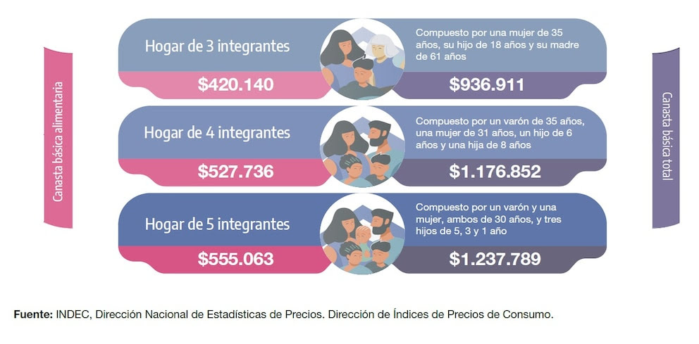 Según el organismo, una familia tipo necesita $1.176.852 al mes para cubrir todas sus necesidades básicas. Aquellos que perciben menos de $527.736 quedan por debajo de la línea de indigencia.