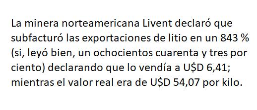 La minera norteamericana Livent aceptó que realizó maniobras con sus declaraciones de exportaciones y pagó a la AFIP unos 5.300 millones de pesos en multas. La Aduana Argentina descubrió maniobras de subfacturación en más de 400 operaciones de exportación efectuadas por la empresa estadounidense.