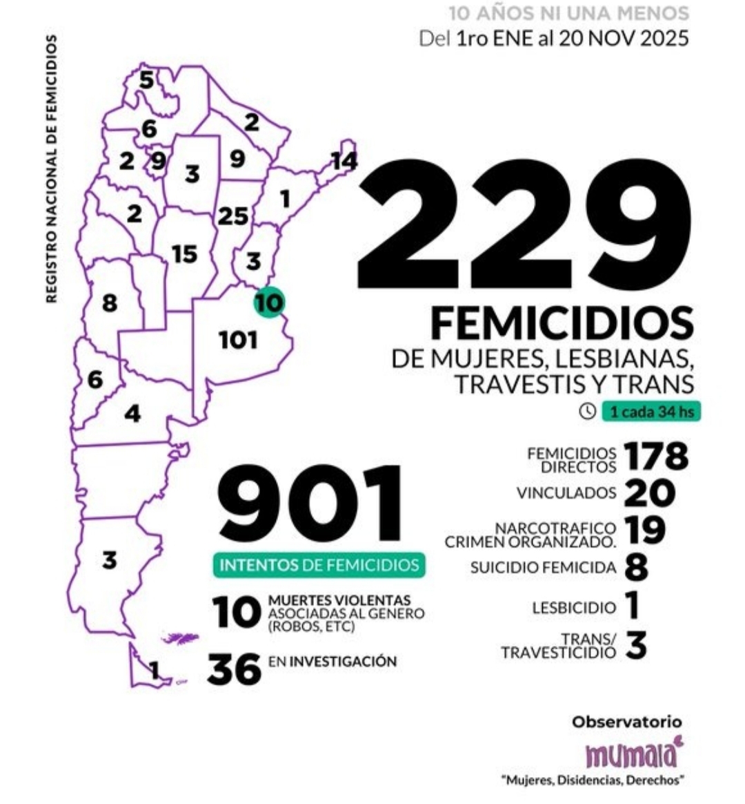 En el Día Internacional por la Eliminación de la Violencia contra las Mujeres, el Observatorio Nacional de Mumalá difundió un informe que vuelve a mostrar la gravedad de la violencia machista en el país. Entre el 1° de enero y el 20 de noviembre de 2025, la organización registró 229 femicidios en Argentina, es decir, uno cada 34 horas. De ese total, 3 ocurrieron en Entre Ríos,  donde además se abren más de mil expedientes por mes vinculados a situaciones de violencia contra mujeres