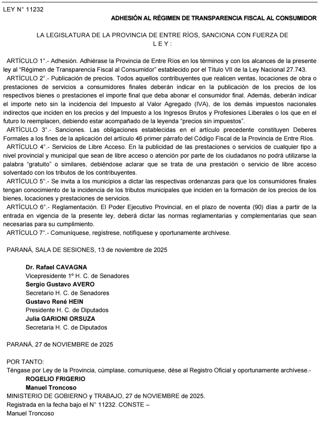 La Legislatura de Entre Ríos sancionó la Ley Nº 11.232, mediante la cual la provincia adhiere formalmente al Régimen de Transparencia Fiscal al Consumidor previsto en el Título VII de la Ley Nacional 27.743. La norma, ya promulgada por el gobernador Rogelio Frigerio y publicada este lunes en el Boletín Oficial, establece nuevas obligaciones de información para comercios, prestadores de servicios y entidades públicas.