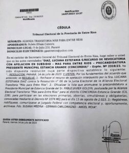 En una decisión unánime, el Tribunal Electoral de Entre Ríos desestimó la apelación presentada por Luciana Estefanía Díaz contra la Resolución N° 06 de la Junta Electoral de la Alianza Electoral Transitoria «Más para Entre Ríos». Díaz impugnaba la candidatura de Pablo Javier Goldin como precandidato a Presidente del municipio de Estancia Grande debido a antecedentes de violencia laboral en contexto de género.