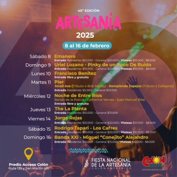 Durante 9 noches, del 8 al 16 de febrero, la ciudad de Colón vivirá una fiesta con más de 200 artesanos destacados de todo el país, y shows de primer nivel. Vale señalar que los precios de las entradas generales oscilan entre 10.000 y 20.000 pesos, dependiendo de la ubicación. Además, aquellas noches con plateas disponibles tendrán un costo de 8.000 pesos. Publicamos aquí la grilla de espectáculos.