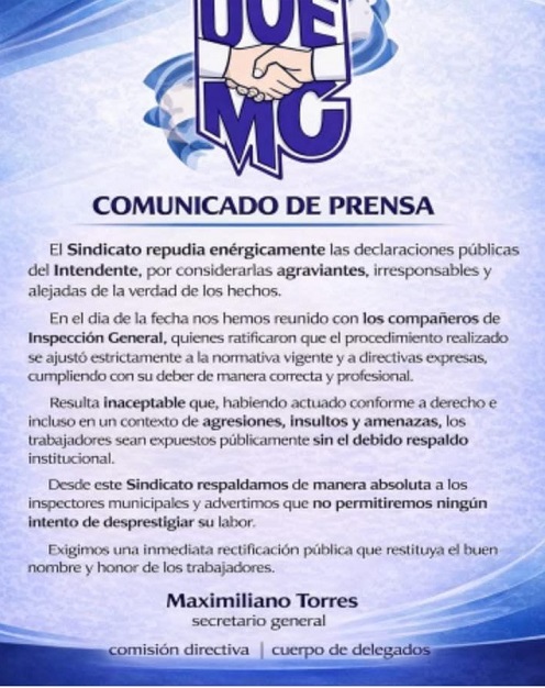 “Desde este Sindicato respaldamos de manera absoluta a los inspectores municipales y advertimos que no permitiremos ningún intento de desprestigiar su labor”, añadieron. “Exigimos una inmediata rectificación pública que restituya el buen nombre y honor de los trabajadores”, manifestaron desde la UOEMC.