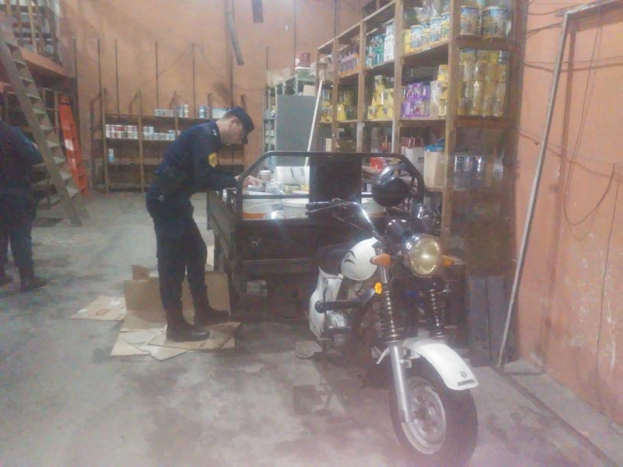 Al llegar al lugar, los efectivos policiales observaron que la puerta de ingreso al depósito del local, ubicado por calle San Luis, se encontraba entreabierta. Al verificar en el interior, lograron la aprehensión de dos hombres de 30 y 47 años de edad, quienes se encontraban en el interior con un motocarro de la marca Guerrero G3R 200 de color blanco y varios «tarros» de látex sintéticos, para piso de piscina y pared, variados en colores y marca.