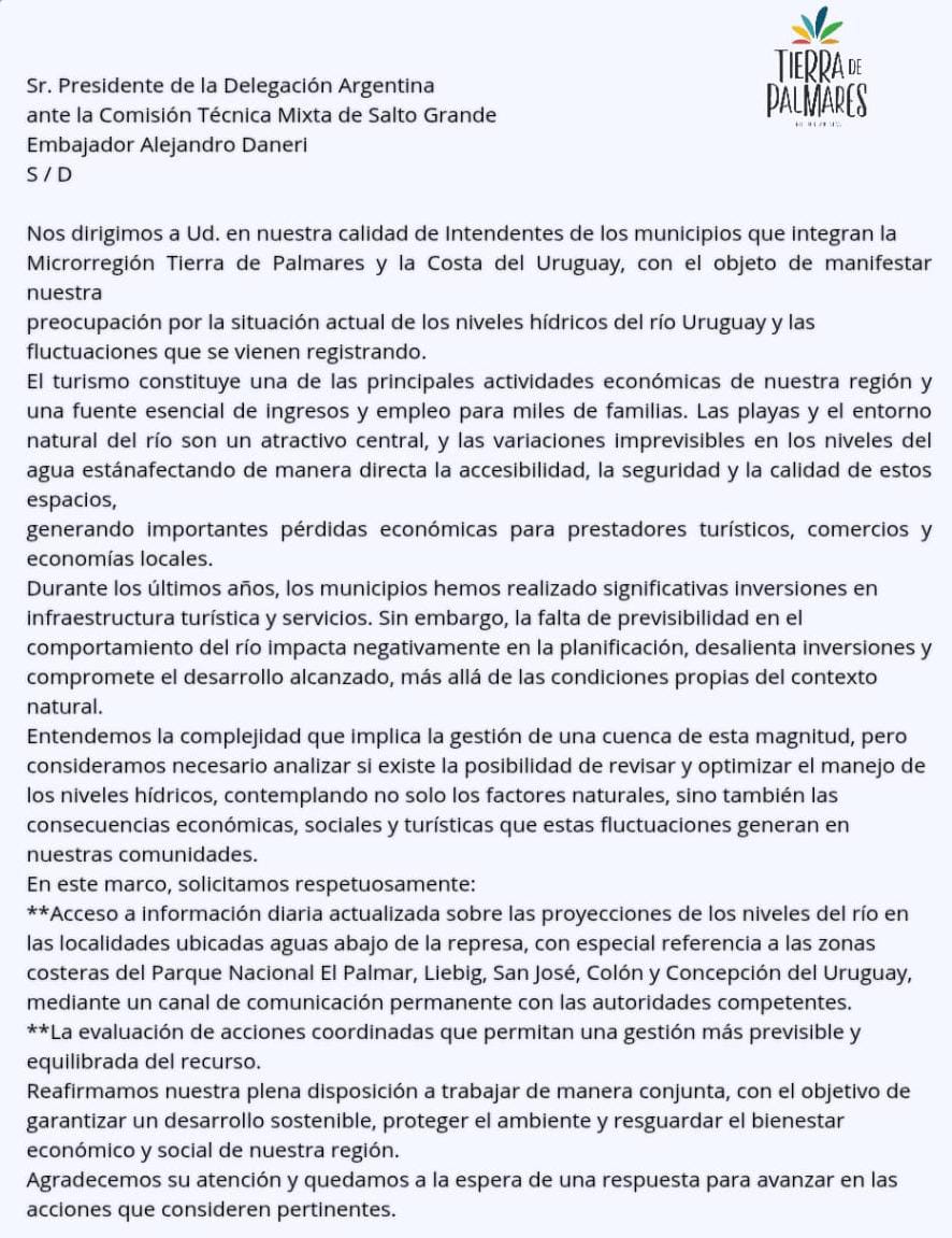 Entre los reclamos concretos, los intendentes solicitaron acceso a información diaria y actualizada sobre las proyecciones de los niveles del río en las localidades ubicadas aguas abajo de la represa, con especial referencia a las zonas costeras del Parque Nacional El Palmar, Pueblo Liebig, San José, Colón y Concepción del Uruguay. Además, exigieron la creación de un canal de comunicación permanente que permita anticipar escenarios y reducir el impacto negativo sobre el turismo y las economías locales.