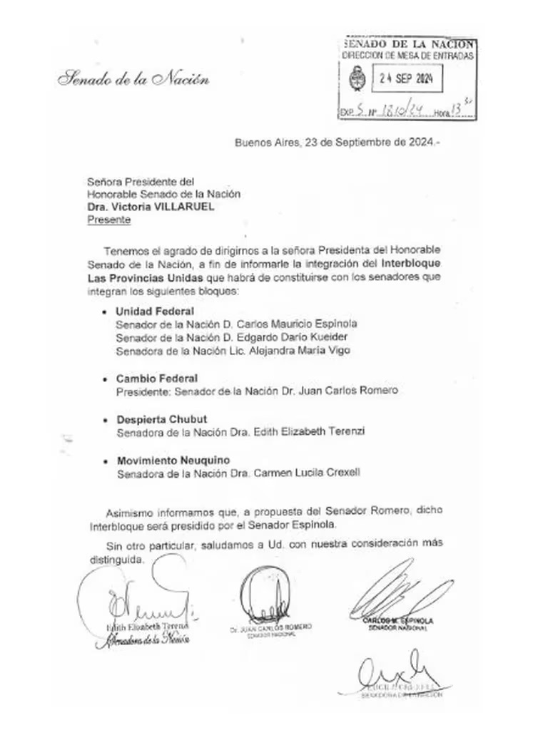 En el nuevo interbloque estarán además el correntino Carlos Espínola, Alejandra Vigo (Córdoba) de Unidad Federal; Juan Carlos Romero (Salta) de Cambio Federal, Edith Terenzi de Despierta Chubut y Lucila Crexell del Movimiento Neuquino. La presidencia del interbloque quedó a cargo del correntino Espínola.