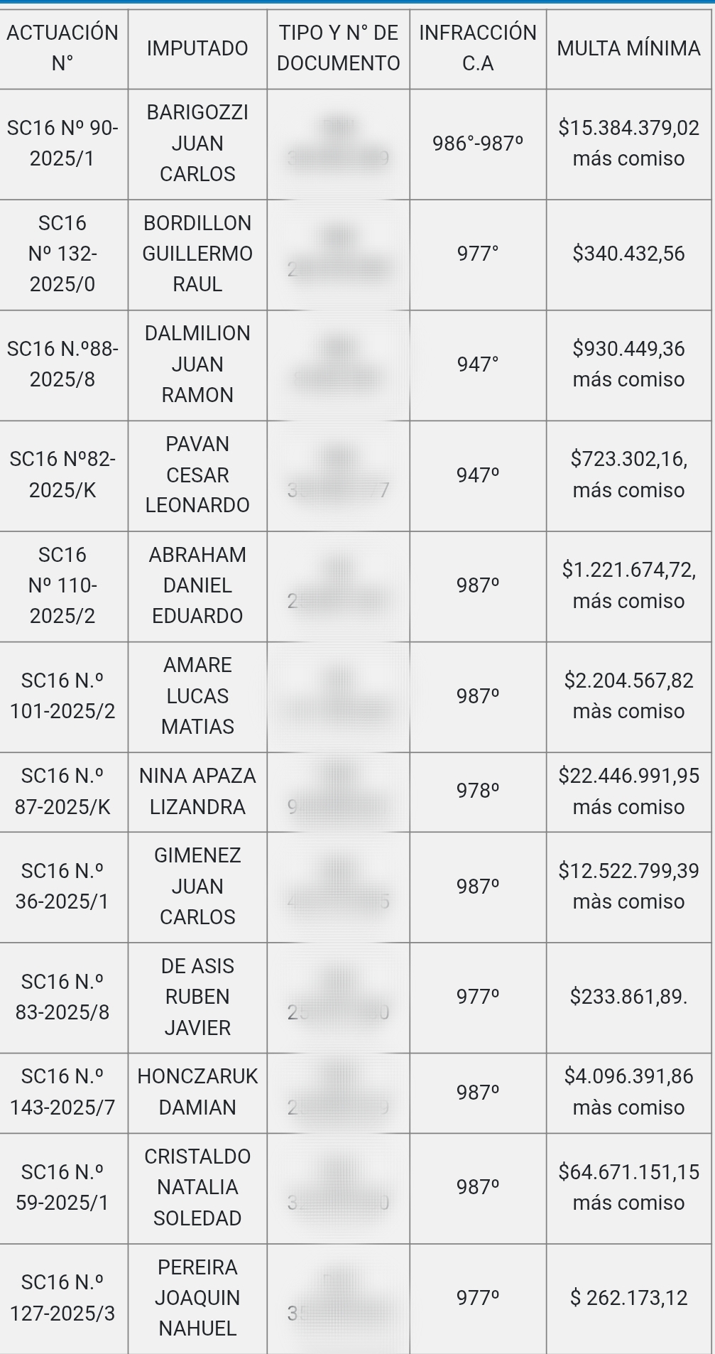 Según el detalle consignado en el cuadro que acompaña el edicto, las actuaciones notificadas por la Aduana de Concordia se encuadran en presuntas infracciones previstas en los artículos 947°, 977°, 978°, 985°, 986° y 987° del Código Aduanero. Los expedientes contemplan multas mínimas que alcanzan montos superiores a los 64 millones de pesos, y en varios de los casos incluyen además la sanción accesoria de decomiso de mercadería.