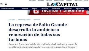 El diario rosarino destaca que “la represa de Salto Grande, ubicada sobre el río Uruguay, se encuentra en pleno proceso de renovación de sus 14 turbinas con las que abastece al 5% del sistema interconectado nacional de energía. La Central Hidroeléctrica Binacional Salto Grande, además, cumple funciones de represa. Se ubica en el curso medio del río Uruguay y se destaca por representar el espíritu de fraternidad con Uruguay. Prueba de ello son el alrededor de 400 personas de ambas nacionalidades que, día tras día, cumplen funciones en sus instalaciones.”