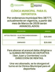La Clínica Municipal del Deportista de Concordia, ubicada en el Gimnasio Polifuncional (Hipólito Irigoyen y Paraná), fue inaugurada en noviembre de 2019 con el objetivo de brindar atención integral, incluyendo aptos físicos, kinesiología, nutrición y psicología. Con el tiempo se convirtió en un centro de referencia regional, atendiendo tanto a deportistas federados como no federados.