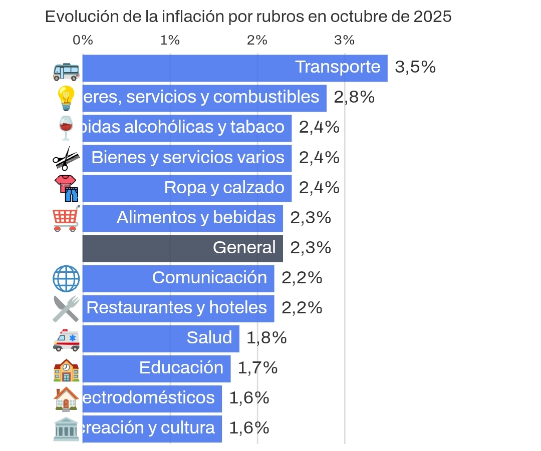 Según el informe del INDEC, los precios al consumidor volvieron a superar el 2% por segundo mes consecutivo, y los rubros que más se incrementaron fueron Transporte (3,5%), seguido de los servicios públicos —agrupados bajo el rubro Vivienda, agua, electricidad, gas y otros combustibles—, que registraron una suba del 2,8%.