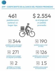 En estos días se conoció un estudio de la Fundación Encuentro que revela la situación laboral de los Rappis y PedidosYa: el promedio de ganancia por pedido es de $2.554, a partir de lo que se calculó que para llegar a un Salario Mínimo se necesitan 126 pedidos, 15 para pagar el monotributo, 190 para criar un hijo y 271 para pagar un alquiler promedio. Para cubrir las necesidades básicas de un hogar de cuatro integrantes, se requieren al menos 35 repartos por día, con un total de 775 al mes.
