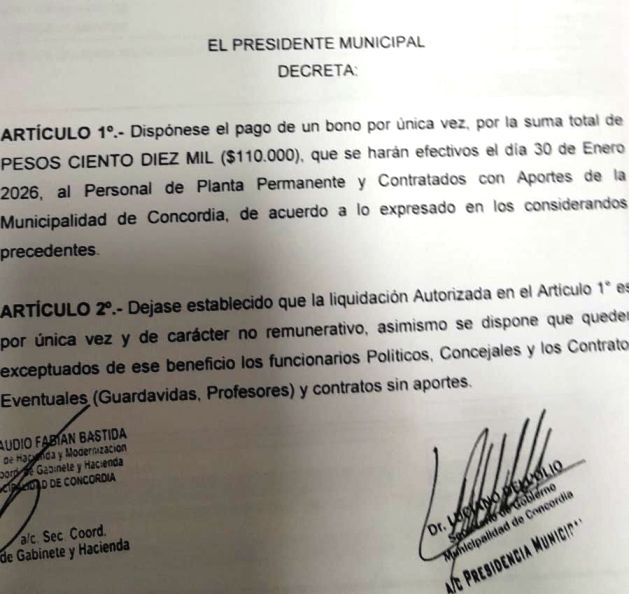 La Municipalidad de Concordia ha dispuesto el otorgamiento de un bono extraordinario de $110.000 para el personal de planta permanente y contratados con aportes. El beneficio se hará efectivo el 30 de enero de 2026, “como una medida para acompañar el esfuerzo de los trabajadores municipales y en respuesta al contexto económico actual”, según el decreto N° 57/26 de fecha 21 de enero al que pudo acceder DIARIOJUNIO. Pero, al mismo tiempo, la semana pasó sin ninguna novedad acerca de los 130 empleados contratados que quedaron afuera del municipio el 31 de diciembre pasado. Los gremios hicieron una medida de fuerza que comenzó el lunes de la semana pasada y la levantaron el jueves otorgándole un plazo de 72 horas al intendente Francisco Azcué para reunirse a los fines de tratar la situación de los despedidos. El plazo se venció a mediados de semana pero no hubo ninguna novedad sobre el tema de los contratados por parte del Ejecutivo ni de los gremios hasta el momento.