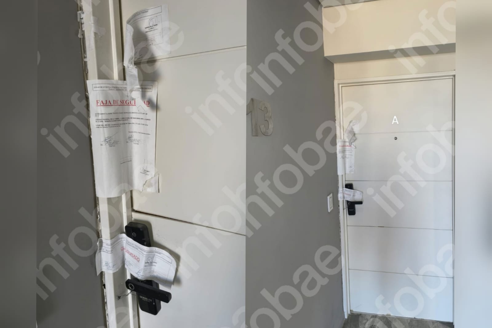 Tras los allanamientos judiciales realizados en el edificio Live, uno de los departamentos —el semipiso ubicado en el último piso— quedó con la puerta dañada. Para ingresar al lugar, los investigadores debieron forzar el acceso y actualmente la puerta permanece sostenida con un alambre, todavía con restos de las fajas de clausura colocadas por la Justicia.