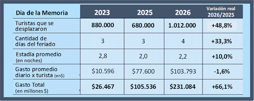 El informe destaca que, en comparación con 2025, la cantidad de viajeros creció un 48,8%, impulsada por la mayor extensión del fin de semana y una mejor predisposición a realizar escapadas, aunque de menor duración. Sin embargo, el gasto promedio diario se ubicó en $103.793, lo que representa una caída del 7% respecto al feriado de Carnaval y del 1,6% interanual en términos reales.