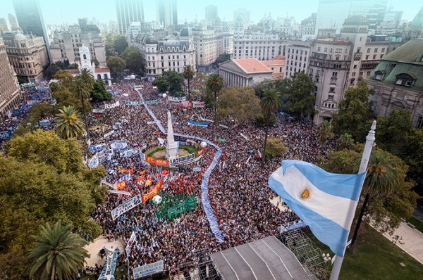 Pérez Esquivel habla del proyecto de país del gobierno de La Libertad Avanza. “La patria no se vende, se defiende”, dice el fundador del Servicio de Paz y Justicia (Serpaj). Y desde la Plaza empiezan los cánticos frente a la decisión de echar por tierra todas las empresas públicas. Hay aplausos para los trabajadores de la agencia estatal Télam y para los de la TV Pública, todos ellos con la espada de Damocles del cierre que anuncia Milei.