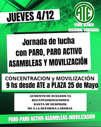 En el marco del paro provincial de ATE (Asociación de Trabajadores del Estado) Concordia, se confirmó que el próximo jueves 4 de diciembre habrá una movilización, a las 10, con destino a la Plaza 25 de Mayo para realizar una asamblea frente a la municipalidad. La columna saldrá desde la sede del gremio, en Aristóbulo del Valle y Brown, según informó el Secretario de Organización de ATE Concordia, Cristian Selva, a DIARIOJUNIO.