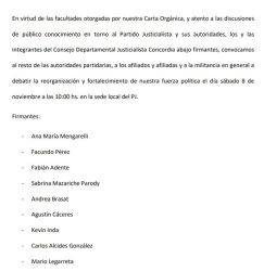 La reunión fue impulsada por nueve integrantes del Consejo Departamental, quienes invocaron “las facultades otorgadas por la Carta Orgánica” del PJ y convocaron a todas las autoridades, afiliados y militancia. Firmaron Ana María Mengarelli, Facundo Pérez, Fabián Adente, Sabrina Mazariche Parody, Andrea Brasat, Agustín Cáceres, Kevin Inda, Mario Legarreta y Carlos Alcides “Corcho” González, este último procesado por la venta fraudulenta de la sede de la Mutual de Músicos Concordia de la cual era el tesorero y quien en breve firmaría un juicio abreviado aceptando los cargos que se le imputan.